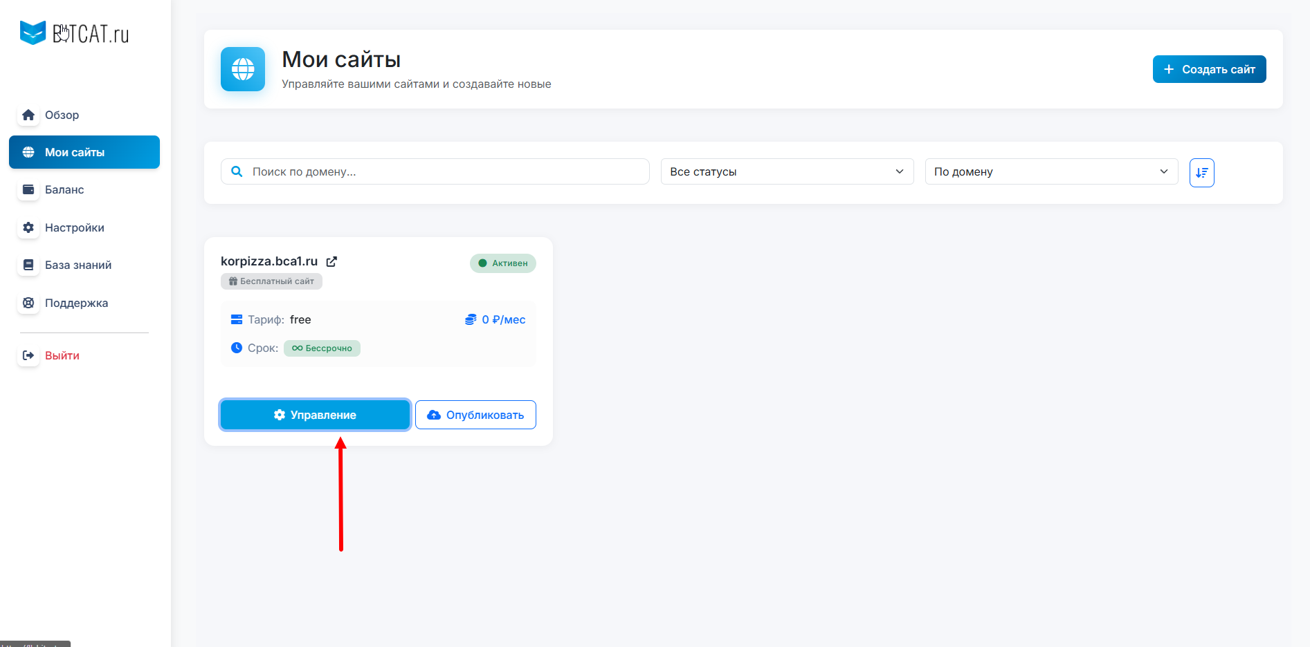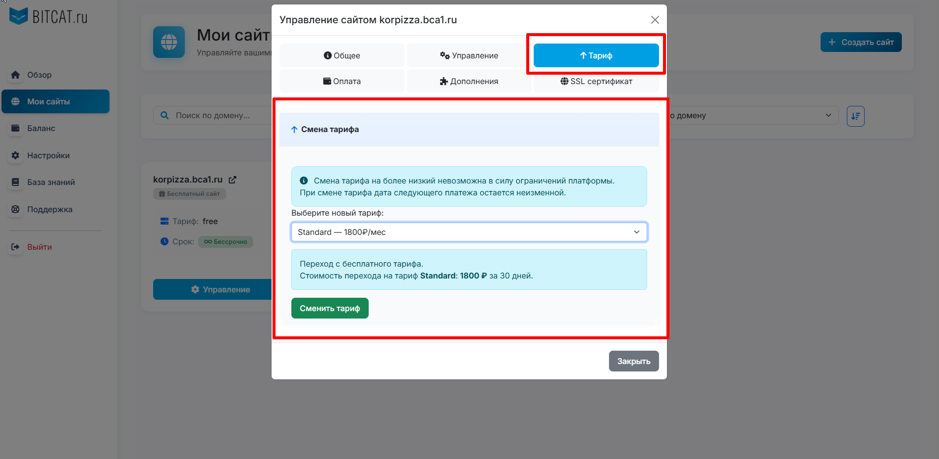 Для смены тарифа сайта необходимо перейти в его настройки.